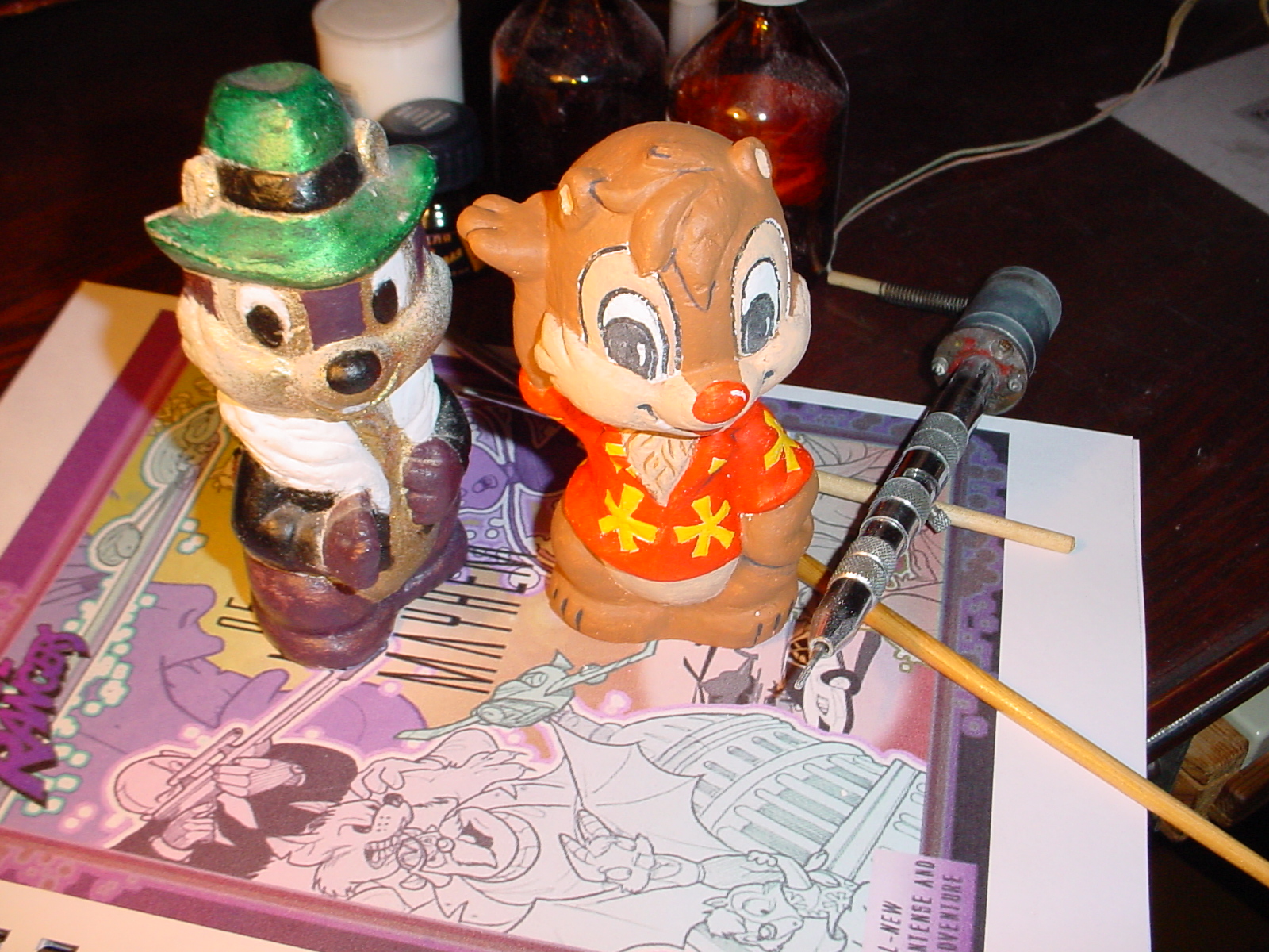 Отливал в гипсовых формах, Чип сразу планировался для работы, поэтому в раствор была упрессована пачка гвоздей - он служил прижимом для трафаретов и дабы не сдуло ни при каких обстоятельствах был утяжелен. В общем-то на нем вполне можно разглядеть все цвета какими из краскопульта ему доставалось - пузо до сих пор "золотом" отдает ;) Дейл изначально планировался бездельником, поэтому и отлит в виде легкой гипсовой корочки